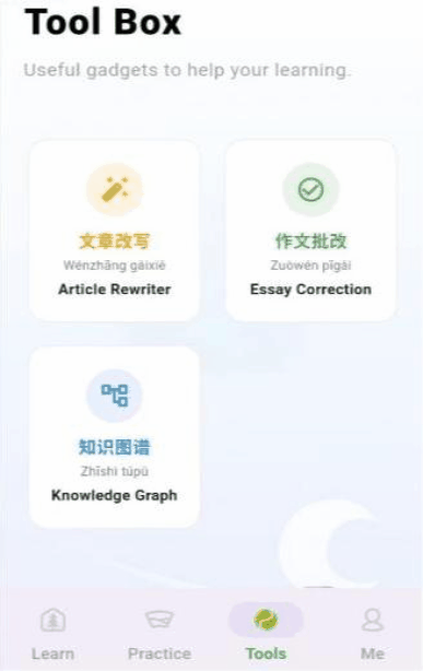 平台以“场景驱动、数据赋能”为核心,构建了多层次、立体化的学习支持体系。在内容层面,平台不仅提供高度定制化的“场景沙盒”,还通过兴趣驱动的“主题闯关”,结合多模态内容生成技术,持续为用户提供新鲜、个性化的学习资源。在工具层面,平台持续推出包括知识图谱、文本改写、作文批改在内的智能辅助工具集,将复杂AI能力封装为轻量、易用的功能模块,实现“即插即用”的语言学习支持。