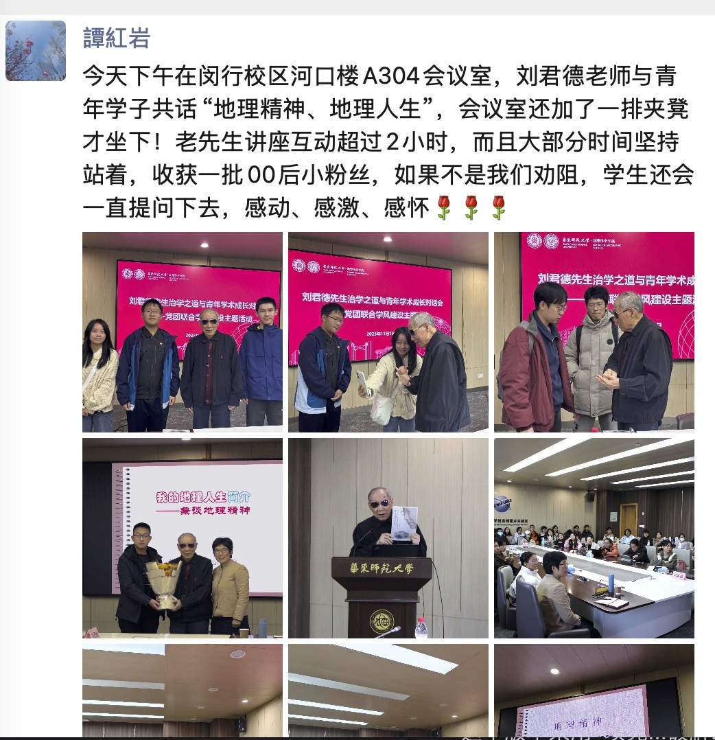 银杏常青,文脉永续。就在前两周,闵行校区河口楼的会议室里,刘君德与青年学子共话“地理精神、地理人生”,现场座无虚席。两个多小时的互动中,学生们热情提问,老先生大部分时间都坚持站着分享治学经历,收获了一群“00后小粉丝”。