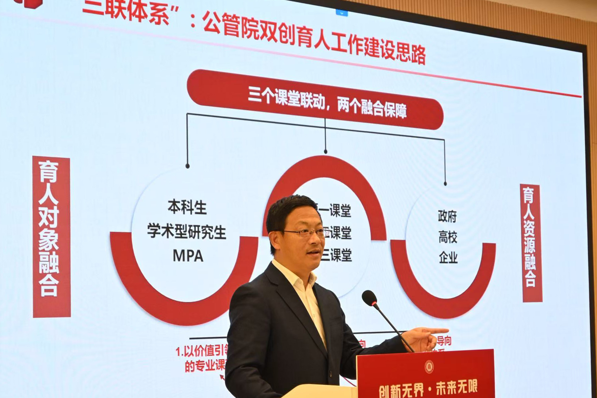 作为荣获本年度创新创业先进集体代表,公共管理学院党委书记高恩新分享了学院构建创新创业育人体系的改革探索历程。学院立足“小规模、复合型”的人才培养特点,依托社会实践基地、跨年级技术团队和全链条项目培育机制,构建创新创业“三联育人体系”,实现了专业教学、社会调查与竞赛训练的有机联动,近年在国家级赛事中取得了喜人成绩。