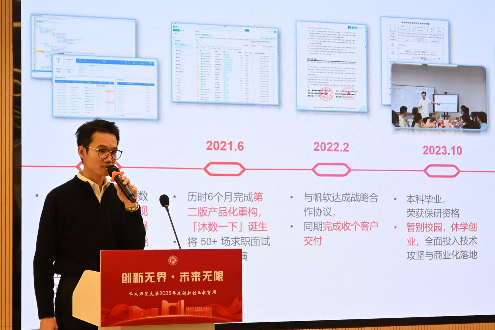 如在2025年获得“创新创业优秀学生年度人物”称号的统计学院硕士研究生杨韬,他带领的《沐数一下——企业AI数据探查与分析解决方案》项目在2025年中国国际大学生创新大赛夺得金奖。五年来,他扎根数字经济领域的创新探索,从企业实习中敏锐洞察行业数字化转型需求,到自主研发自动化脚本提升数据处理效率,再到将专业优势与市场痛点深度结合,与企业达成战略合作并成功交付首个项目,实现了从研发到规模化应用的突破。