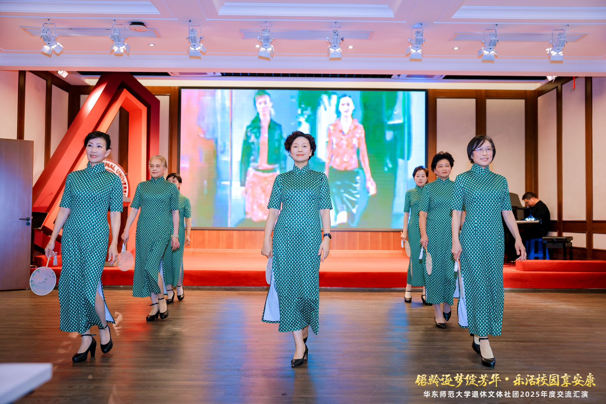 旗袍秀《上海瑶》更是尽显东方韵味,走秀队的老师们身着各式旗袍,身姿挺拔、步态优雅,举手投足间尽显老上海的风情与雅致,该节目曾登上上海市第十届九九重阳节展演舞台,再次呈现依旧惊艳全场。