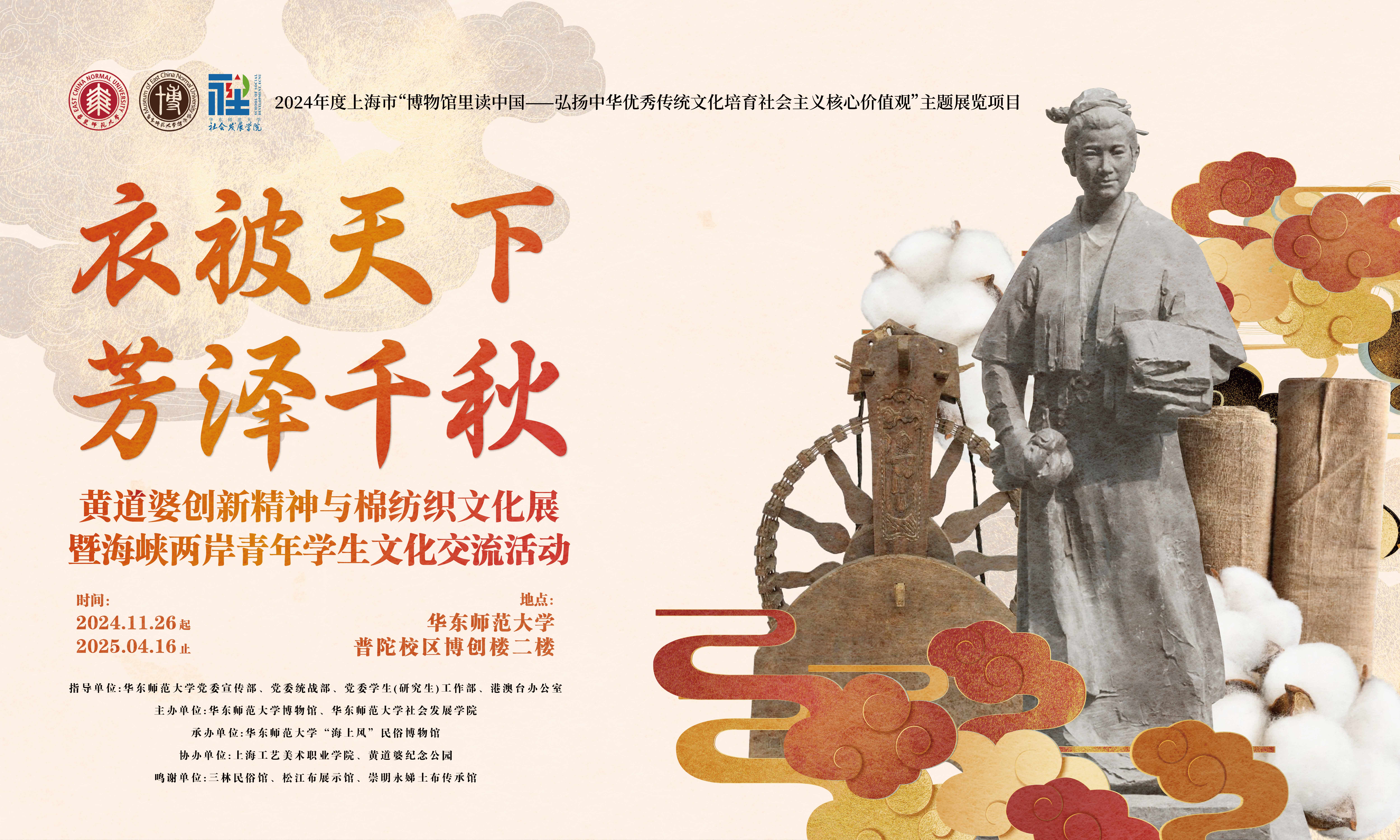 “衣被天下 芳泽千秋——黄道婆创新精神与棉纺织文化展暨海峡两岸青年学生文化交流等系列社教活动”,是深挖中华优秀传统文化、铸牢中华民族共同体意识所打造的品牌社教项目。以棉路与丝路双向奔赴的文明互鉴为核心立意,围绕黄道婆到海南古籍新史料、黄道婆图像、上海棉纺织机器和土布制品等,分为棉路——上海棉纺织枢纽、先棉——黄道婆棉纺织卓越贡献、璀璨——上海棉纺织文物呈现、传承——棉纺织创意作品等4个部分进行展示,并通过图文实物、演示体验、土布服饰走秀以及网上博物馆等形式开展社教活动。同时,该项目还获评2024年度上海市“博物馆里读中国——弘扬中华优秀传统文化、培育社会主义核心价值观”主题展览项目,全市仅有12个展览项目获评,高校博物馆只有2个项目获评。