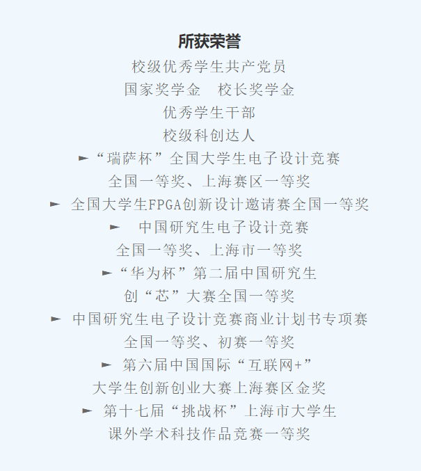 2019年,周家辉带队参加“华为杯”研究生创“芯”大赛,凭借《MEMS数字微镜阵列CMOS电路设计》项目一举拿下了全国一等奖。2020年,他首次参加“互联网+”大学生创新创业大赛,又获得了上海市金奖。
