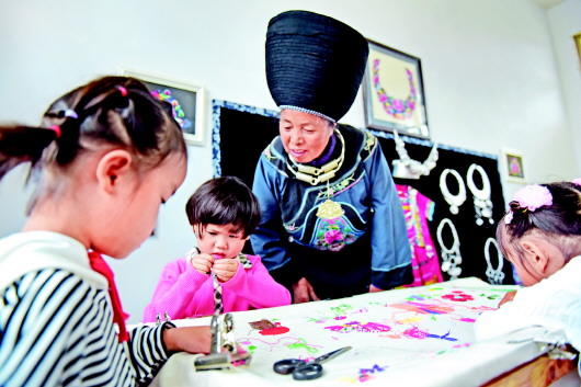 贵州省松桃苗族自治县盘信镇后寨村山村幼儿园学生在学习刺绣