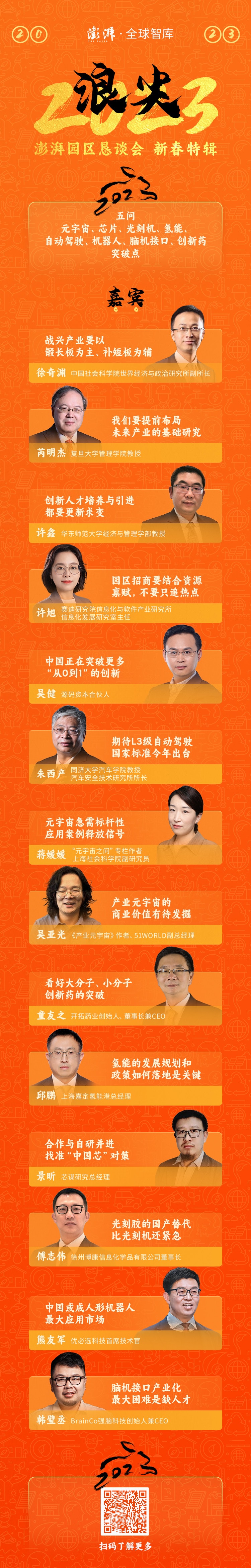 站在2023年的新起点,澎湃园区恳谈会推出新春特辑“浪尖2023”,五问经济学家、产业专家、企业高管、投资人,寻求元宇宙、芯片、光刻机、氢能、自动驾驶、机器人、脑机接口、创新药等产业的突破点。