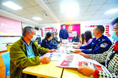 建邺公安分局民警深入辖区,与基层的社区党员、网格员、治安积极分子围坐一堂,认真学习党的二十大报告。 南京日报/紫金山新闻记者 段仁虎 摄