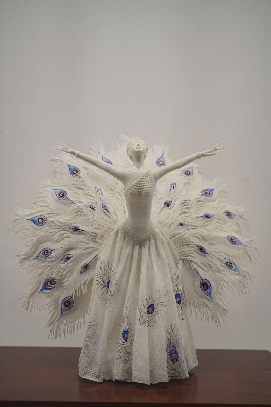 展览现场,《神话》塑造的玉漱公主瓷骨仙姿翩然独立,享受“单间”待遇,最是引得观众挪不开眼睛。只见她在灯光下白中透红,透着独特的温度,任光影在蝉翼般的衣袂间游走,独具东方美学韵味。据其创作者连德理透露,作品从制胎到烧成花了六七年,历经上百次失败。“创作时得不断调整瓷土配比、控制窑温,既需要精益求精的技艺,有时也带点一些运气。”他坦言最终运用自主研发的“高韧薄胎瓷衣技艺”,成功将瓷衣厚度控制在0.2毫米,让坚硬陶瓷化作绕指柔纱,“希望上海的朋友们能感受到白瓷的这份灵动”。