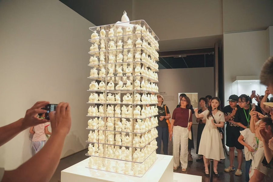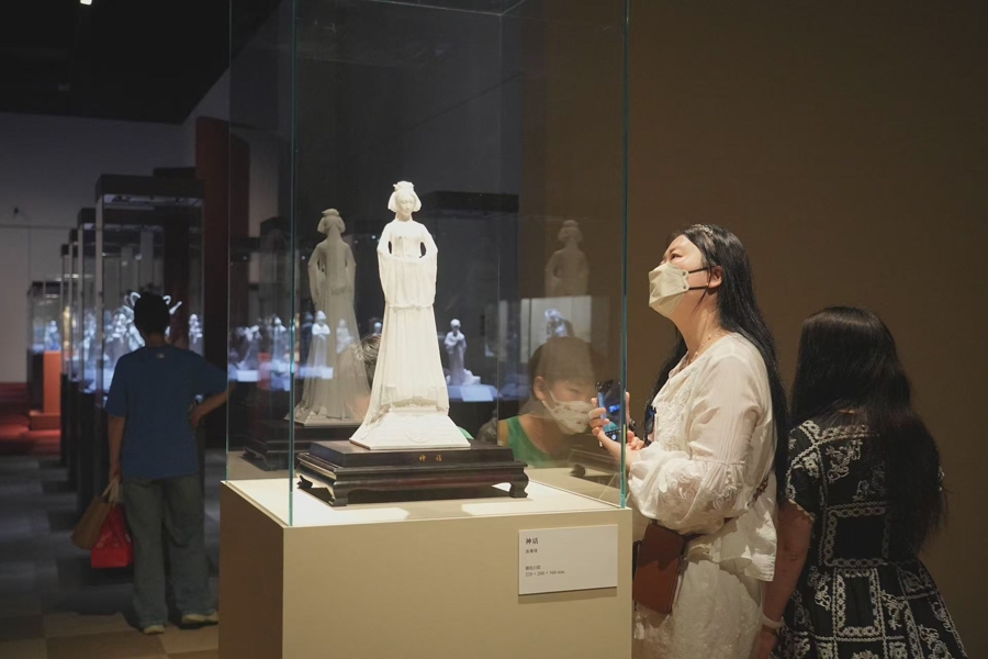 华东师范大学美术学院院长、展览策展人张晓凌告诉记者,千年古县德化,早在3700年前的夏商时期就开始了青瓷的烧造。至宋元时期,莹润如玉的白瓷渐成大势,一跃而成为海上丝绸之路交流的珍宝。明代法国人感慨于德化白瓷的冰心玉之美,将其称为“中国白”。此次展览聚焦的,却更是德化白瓷在当下的守正创新、与时俱进,如何在烧造与瓷雕技术方面自成一体,成为中国工艺与非物质文化遗产体系中出众的存在。