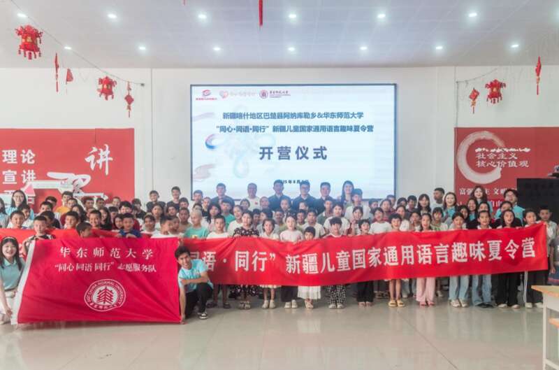 日前,华东师范大学14名来自维吾尔族、哈萨克族、蒙古族、柯尔克孜族和汉族的志愿者服务队师生跨越5000多公里,分赴新疆喀什地区巴楚县和新疆克拉玛依市两地,开展为期近一个月的国家通用语言趣味夏令营,与250余名乡村民族儿童一起用语言架起中华民族共同体的团结之桥,帮助孩子们夯实语言基础、提升人文素养、拓展科学知识、体验智能教育、进行生涯探索。