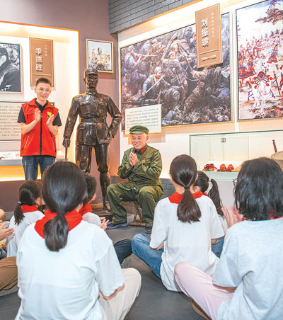 江苏省宿迁市宿城区耿车镇白鹿湖社区暑托班开展“学习革命历史 传承红色基因”主题红色研学活动,孩子们听老兵讲革命故事。(人民图片 徐江海摄)
