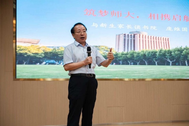 这场由华东师范大学党委学(研)工部(处)指导,大夏书院联合心理与认知科学学院、经济与管理学院联合主办的“筑梦师大,相携启航——书院院长与新生家长面对面”活动上,大夏书院院长、心理与认知科学学院教授、校家庭教育研究院学术委员会主任庞维国与来自各学部、学院的近300名新生家长面对面交流。