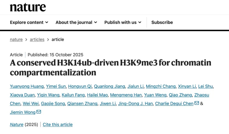 北京时间10月15日23时,华东师范大学翁杰敏教授团队与中国科学院生物化学与细胞生物学研究所陈德桂研究员团队合作,在国际顶级期刊《自然》上发表最新研究成果,首次揭示了一种在哺乳动物细胞中控制染色质分区以及近着丝粒异染色质形成、维持和稳态遗传的新机制。