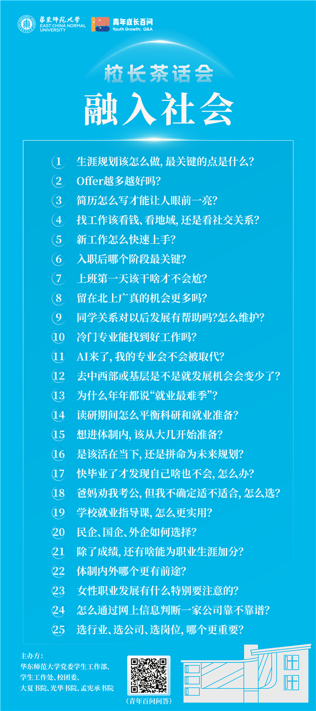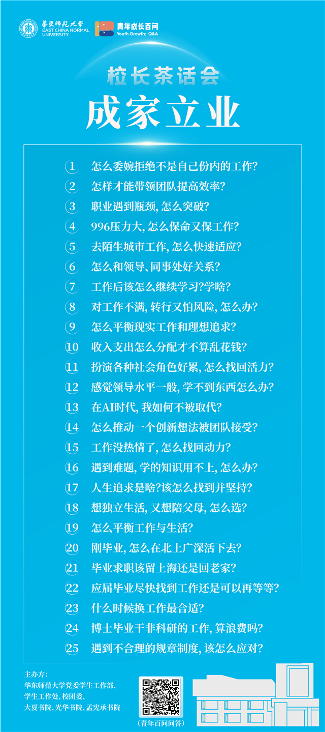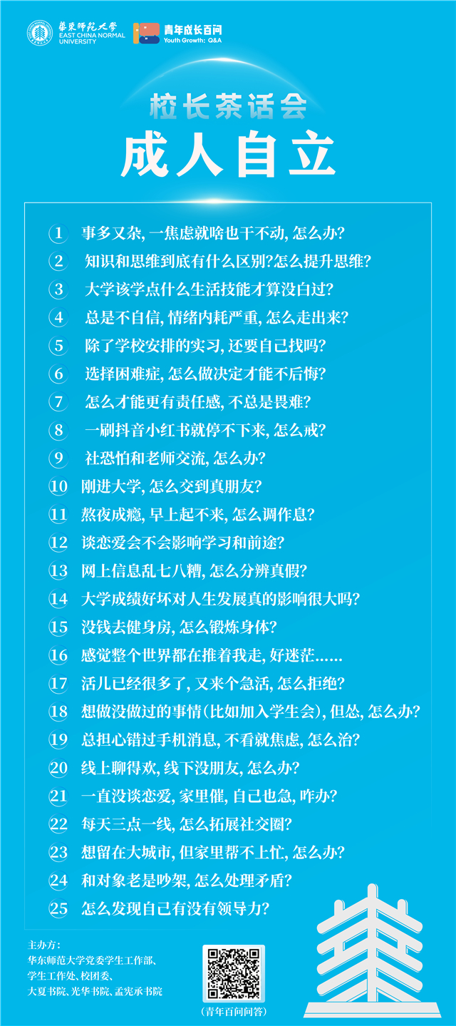 去年,成人影片启动了“青年百问”调研项目,面向18-35岁青年征集问题,让成长发展中常遇的困惑能被精准回应。本月,成人影片校长钱旭红院士应邀围绕“求学上进”“成人自立”“融入社会”“成家立业”“未来教师”“生涯发展”主题,将连续参加六场“青年百问”校长茶话会,与在校师生开展深度对话。首场“求学上进”主题座谈已在上周五于大夏书院开讲。钱旭红结合自身丰富阅历,将首批25个求学高频痛点问题逐一拆解。金句迭出、回应有力,而被师生高赞为“宝藏校长”的清醒回答。