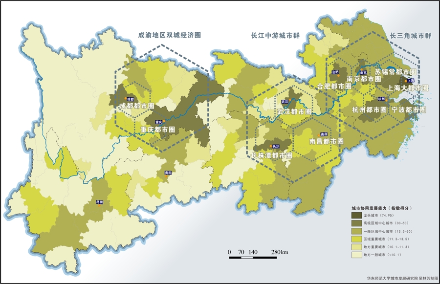 长江经济带城市体系橄榄型结构不断优化。110座地级及以上城市呈现出6等级橄榄型结构特征,其中,上海是龙头城市,协同发展能力在长江经济带排名首位;杭州、南京、成都、苏州、武汉、重庆、无锡、宁波、合肥、长沙10座城市是能力较强的高级区域中心城市;常州、昆明、南通、嘉兴、南昌、贵阳等46座城市是在个别领域表现突出的一般区域中心城市。此外,还有一系列城市分别为区域重要城市、地方重要城市、地方一般城市。